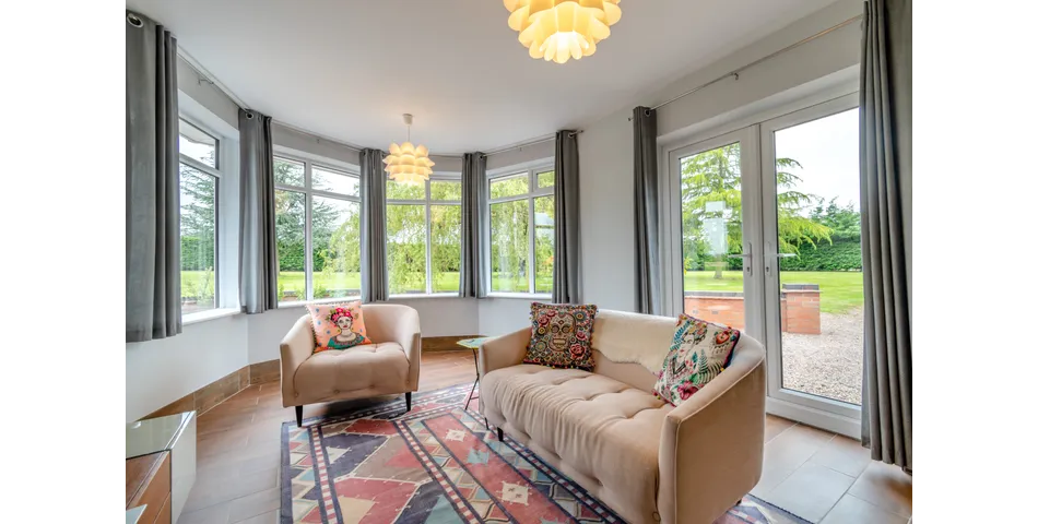 The heart of the home is the striking open-plan kitchen with vaulted ceiling, opening directly into a spacious Garden Room perfectly positioned to make the most of the outlook across the grounds. A separate dining room and large sitting room provide further reception space, ideal for both entertaining and everyday family life.